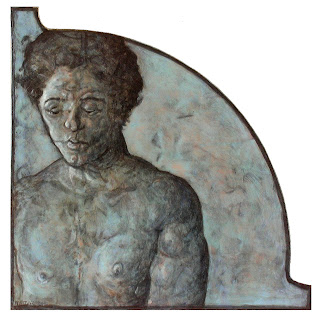 "Figure Emerging From Rust" 5" x 5" acrylic on zinc over copper, 1997, Richard Britell